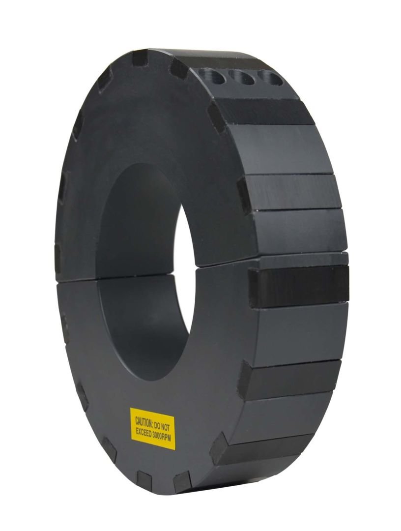 Standard Pulser Wraps have magnets mounted on the outside circumference that serve as targets for Hall Effect and Magnetoresistive sensors that switch when exposed to magnetic fields. All wraps are custom machined to the diameter of the monitored shaft and are split into halves. The halves are secured around the shaft with recessed Allen head socket screws (supplied). Standard pulser wraps provide magnetic targets that are strong enough to allow gap distances up to 1/2 inch. Standard Wraps are 1.5" wide and have a minimum outside diameter of 4"