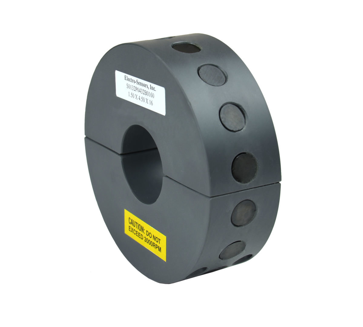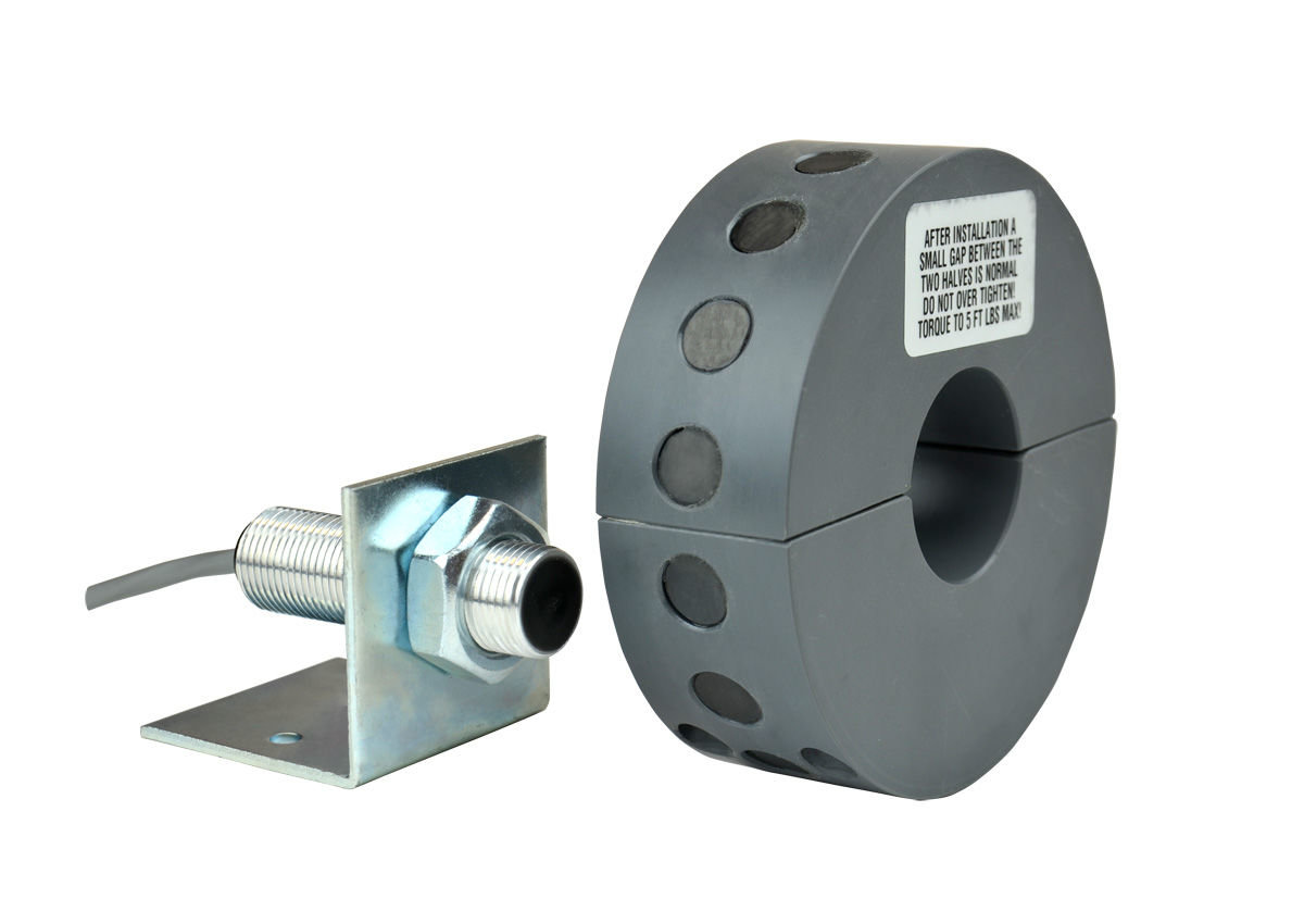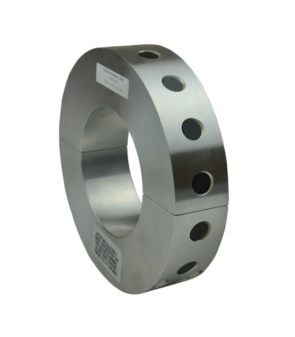 Standard Pulser Wraps have magnets mounted on the outside circumference that serve as targets for Hall Effect and Magnetoresistive sensors that switch when exposed to magnetic fields. All wraps are custom machined to the diameter of the monitored shaft and are split into halves. The halves are secured around the shaft with recessed Allen head socket screws (supplied). Standard pulser wraps provide magnetic targets that are strong enough to allow gap distances up to 1/2 inch. Standard Wraps are 1.5" wide and have a minimum outside diameter of 4"