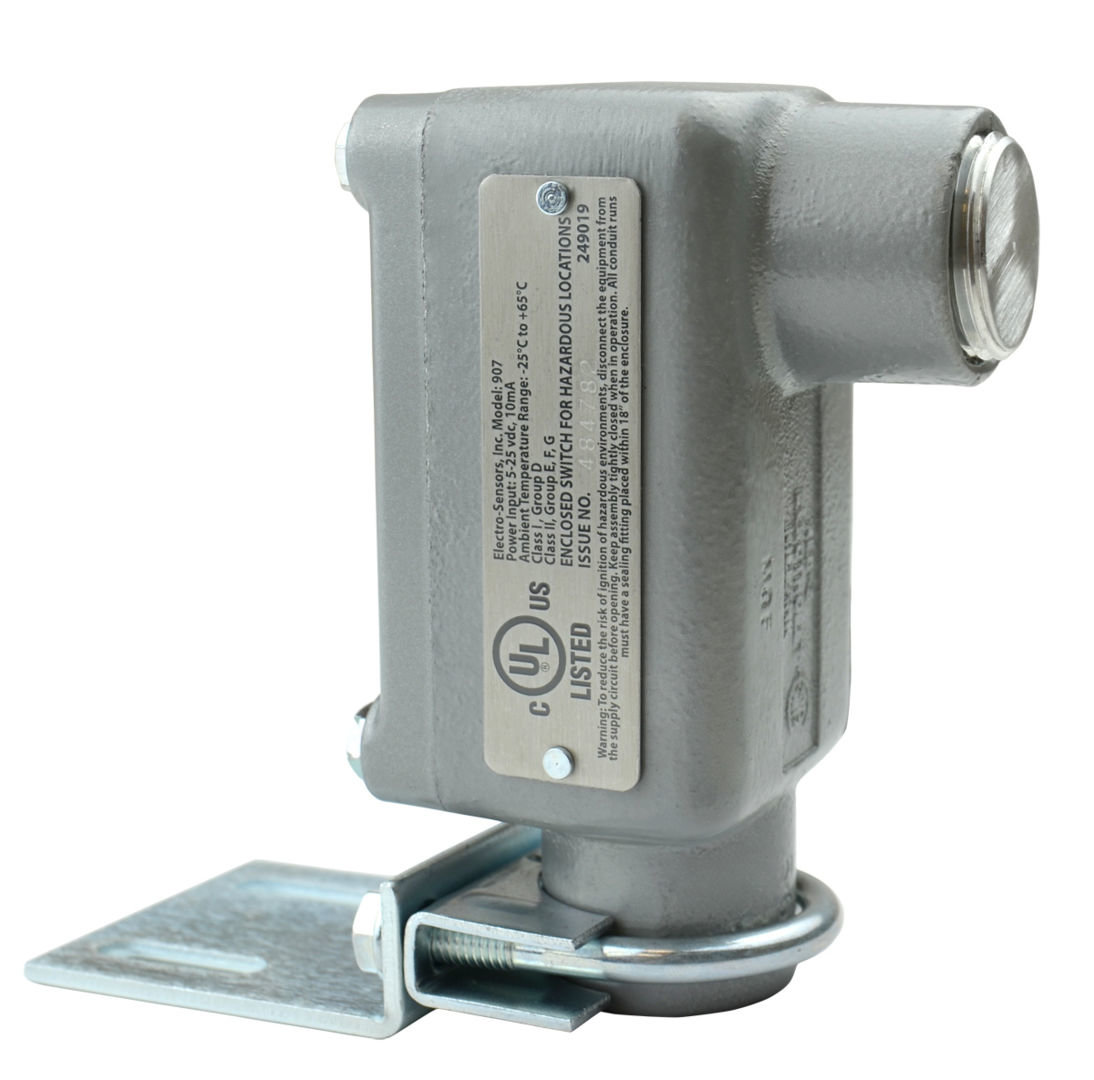 907 XP sensors are used in applications requiring hazardous location ratings, or in applications where the sensor may be subject to abuse. It has a 1-inch NPT conduit opening for wiring, terminal strip for wiring, and is provided with a mounting bracket and 10 ft of cable. The quadrature (bidirectional) option has two sensors and is designed for applications requiring both speed and direction information. Specify vertical alignment when the magnets will pass vertically in front of the sensor face, and horizontal alignment when the magnets will pass horizontally in front of the sensor face.