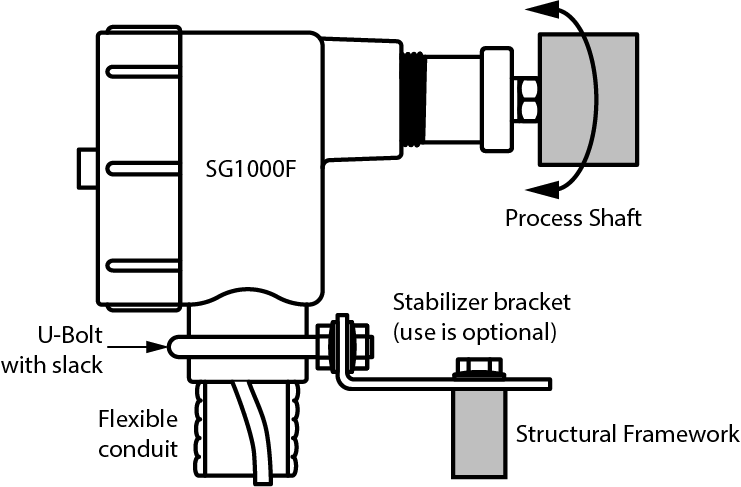 The SG1000F mounts directly to the end of the drive shaft of a slide gate or valve and is easily calibrated with a single push-button switch for setting the application’s fully-closed/fully-open positions. As the drive shaft rotates, the SG1000F measures the rotation and outputs the 4-20 mA signal to a PLC or the Electro-Sensors optional PM500 Remote Display. The SG1000F’s output signal is 4 mA for fully-closed and 20 mA for fully-open. Most importantly, the SG1000F offers the greatest amount of accuracy for two-turn (maximum) shaft rotation applications.
