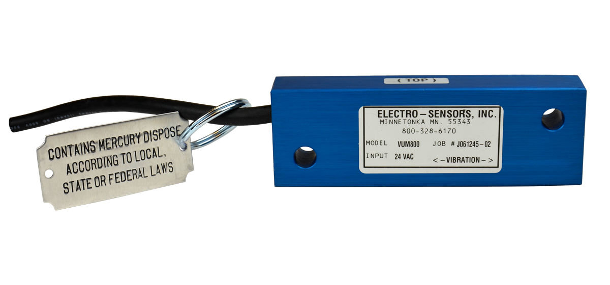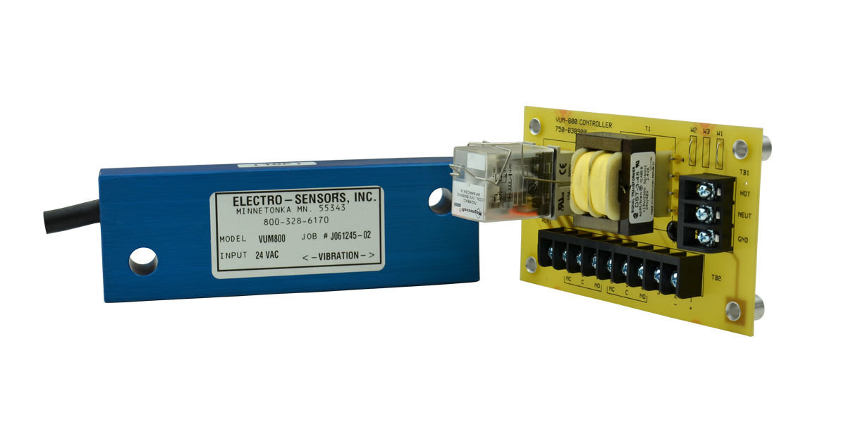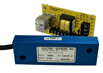 The VUM800 Vibration Monitor confirms normal operation of processes utilizing continuous vibration. Since the VUM800 measures actual vibration, not motor rotation, power draw, or any other implied measures, all sources of failure are detected: power loss, motor or gearbox failure, belt slippage, and breakage. Applications include shaker screens, vibratory feeders, bin bottoms, and crushers. The solid state electronics of the rugged VUM800 are epoxy encapsulated in metal. The VUM800 is easily installed and needs no calibration or maintenance. The unit is failsafe; power loss or a broken cable will indicate an alarm situation.