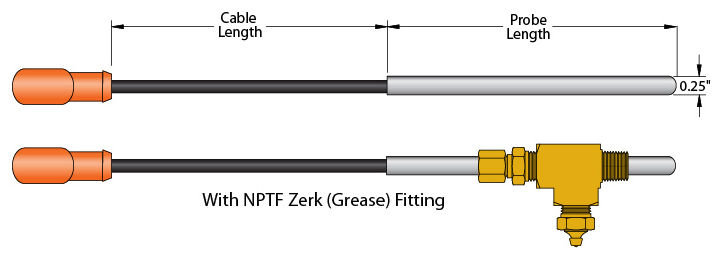 1/4" stainless steel probe is used with bearings, thermowells, and compression fitting mounts on tanks and piping. Available with or without compression fitting adapters.