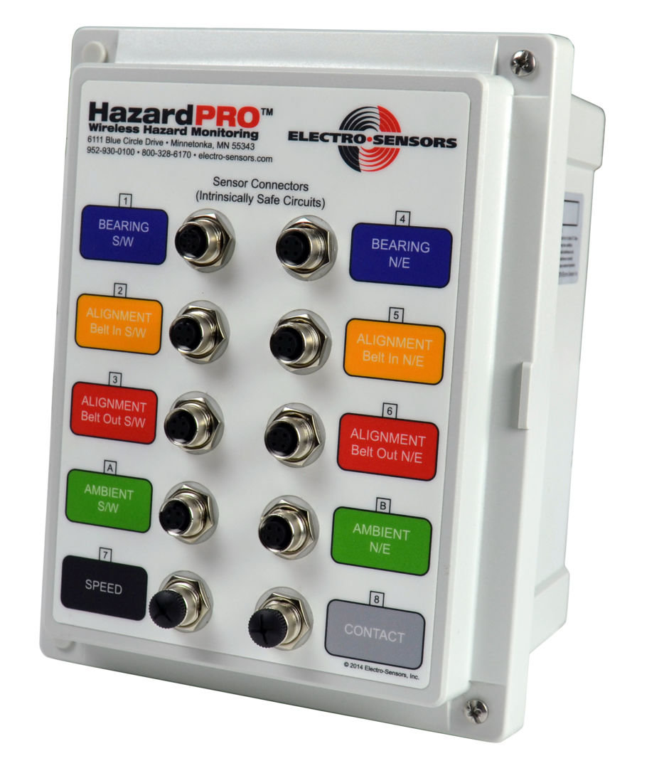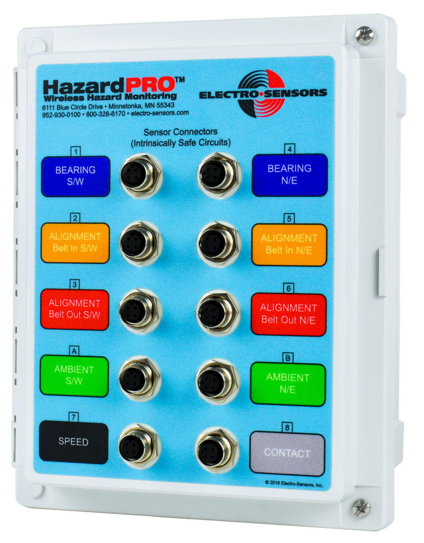 The battery-powered I.S. HazardPRO Node is the sensor-input building block for HazardPRO Hazard Monitor Systems, providing intrinsically safe connections for 10 HazardPRO (and compatible) sensors (8 temperature, 1 shaft speed, 1 switch contact). Nodes power their sensors, acquire their signals and transmit to the HazardPRO System Manager via wireless (802.15.4) network.
