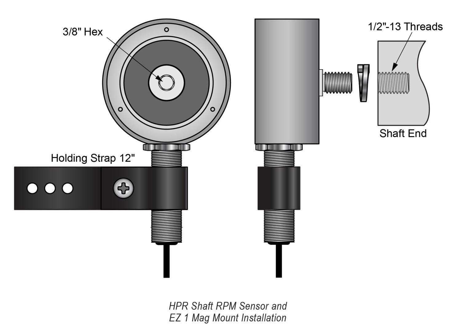 The shaft RPM sensor is typically mounted to the tail shaft of the machine being monitored. The sensor is mounted in the EZ 1 Mag mounting bracket assembly, which attaches to the tail shaft with a 1/2"-13 UNC tapped hole.