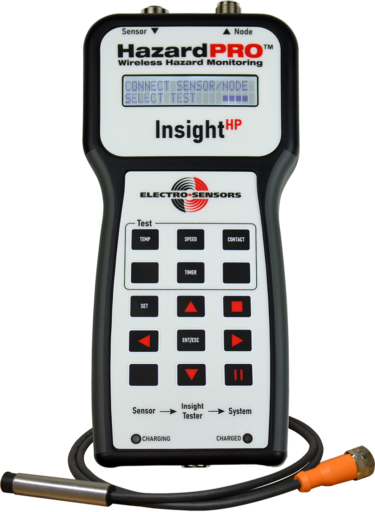 Testing a HazardPRO sensor can be done using one of the three Sensor Test buttons on the InsightHP tester. Plug the sensor cable connector into the InsightHP Sensor input, press the appropriate Test button (Temperature Sensor, Speed Sensor or Contact Sensor) and verify the displayed sensor measurement. HazardPRO system response can be tested by running a system test, disconnect that sensors cable connector from its HazardPRO node input and plug it into the InsightHP quick-connect Sensor input, then plug the InsightHP Node output cable connector into the HazardPRO node input the sensor was previously connected to, press the appropriate Test button (Temperature System, Speed System or Contact System) and follow the displayed instructions.